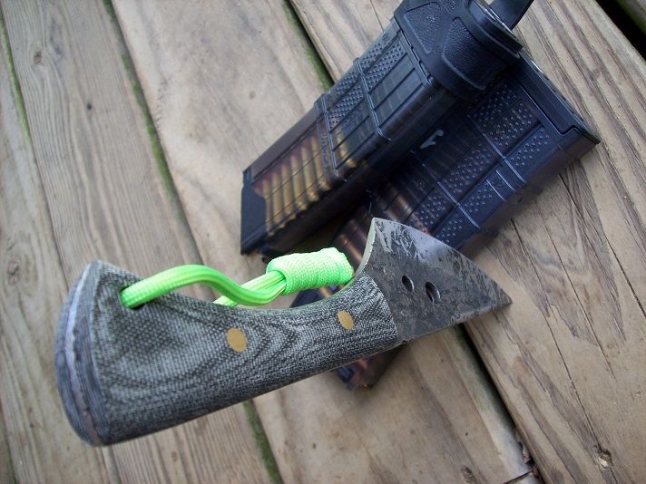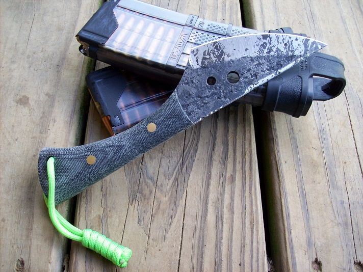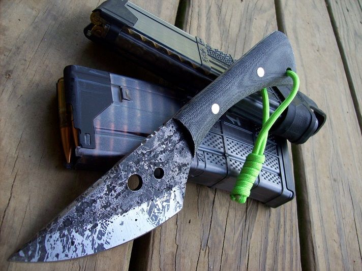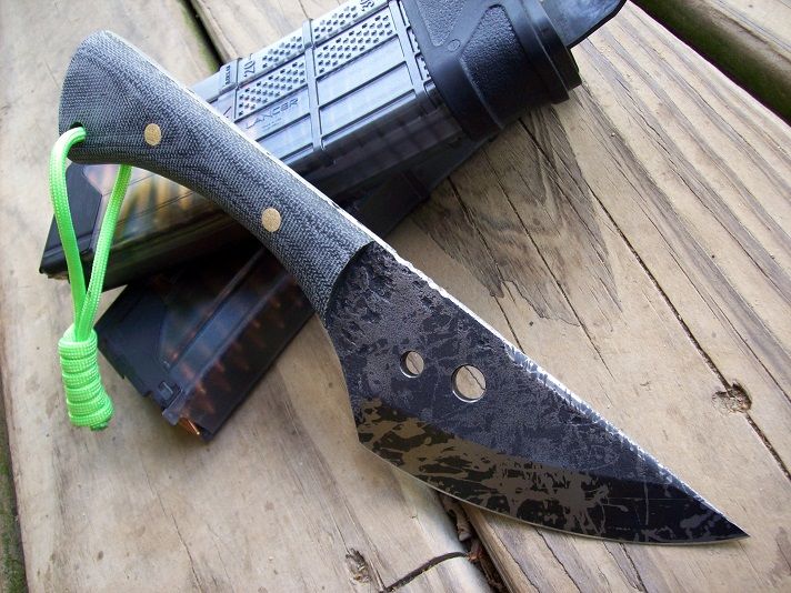 Dozer prototype in Crucible Forge V steel and black micarta. multi-layer acid etched pattern looks like lava rock. hollow ground and 9" overall. differentially heat treated and triple tempered. comes with leather belt sheath for $175 shipped in the US. **SOLD**
