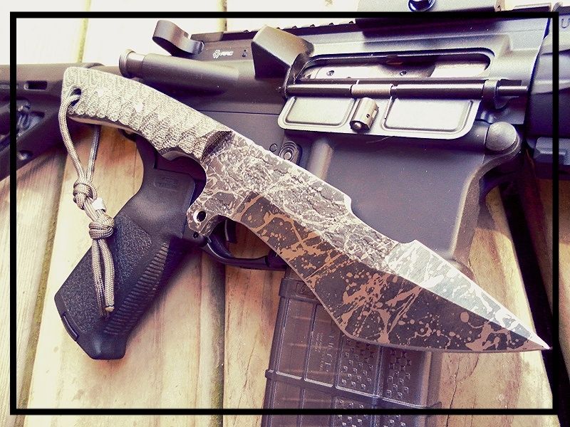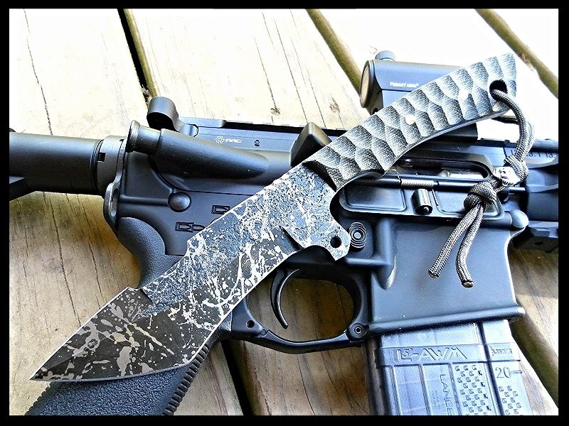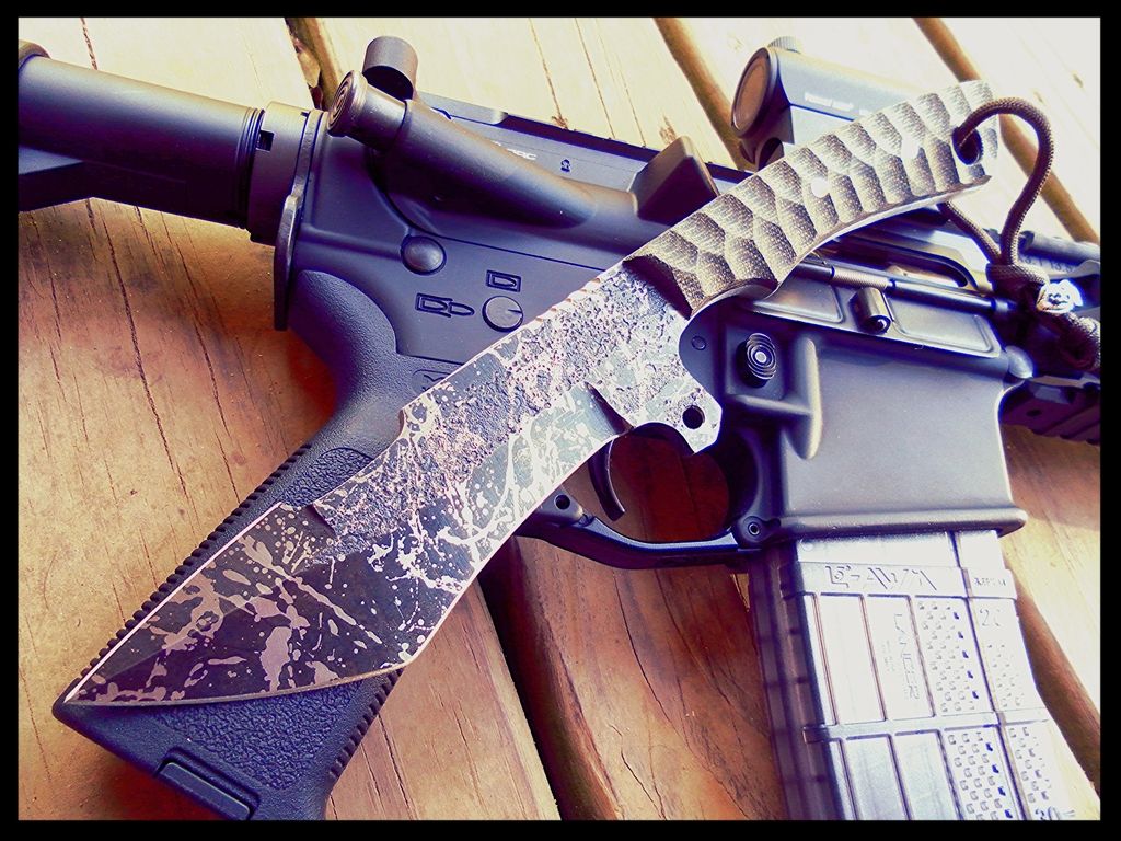 liontribe Well-Known Member May 4, 2015 #1 10.75" fighter design from forged 5160 spring steel. recurve hollow grind and swedge, both fully sharpened. Crime Scene acid etched finish with OD/black micarta handle. comes complete with fitted leather sheath for $325 shipped US. liontribe
