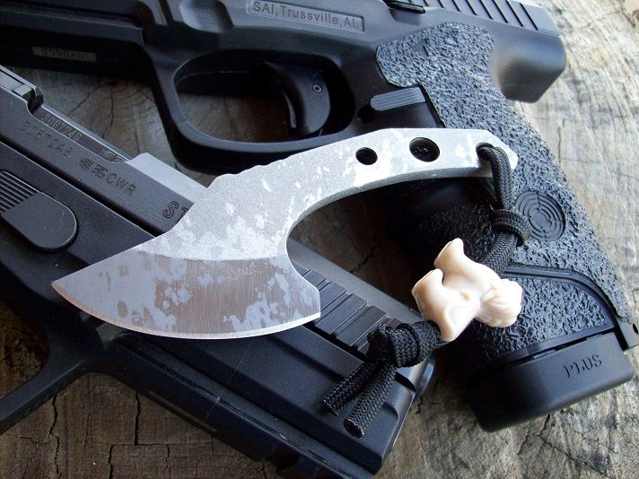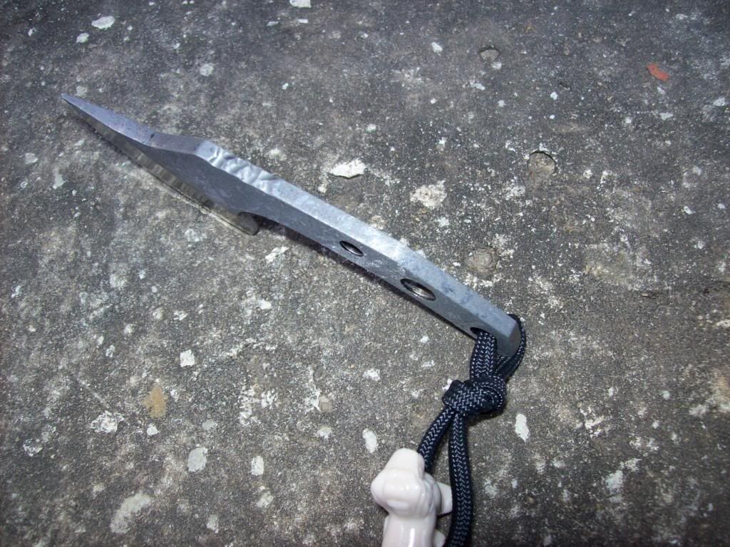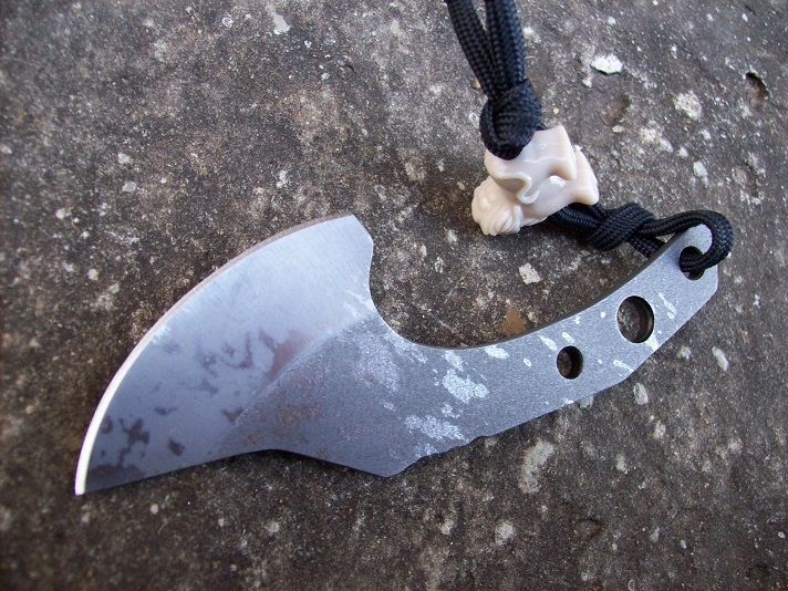this one is O-1 tool steel and 4.25" long. flats are bead blasted and the blade is hollow ground. the finish is a mottled, smoky acid etch. my pics suck, looks so much cooler in person. random filework on the spine for added traction. comes complete with a kydex pendant style sheath. asking $85 shipped in the US. *SOLD*